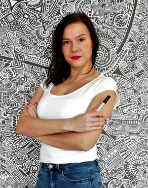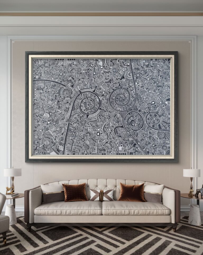 Ten obraz w tym wnętrzu działa, jak punkt skupienia — przyciąga wzrok od razu po wejściu do pomieszczenia. Gęsta, czarno-biała kompozycja pełna spiral i mikrodetali kontrastuje z uporządkowaną, spokojną aranżacją salonu, dodając mu energii i intelektualnej głębi. Surowa geometria i rytm linii świetnie korespondują z symetrią mebli oraz stonowaną paletą barw, dzięki czemu całość pozostaje …