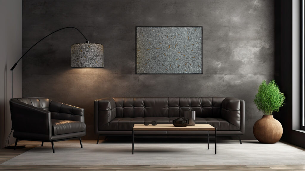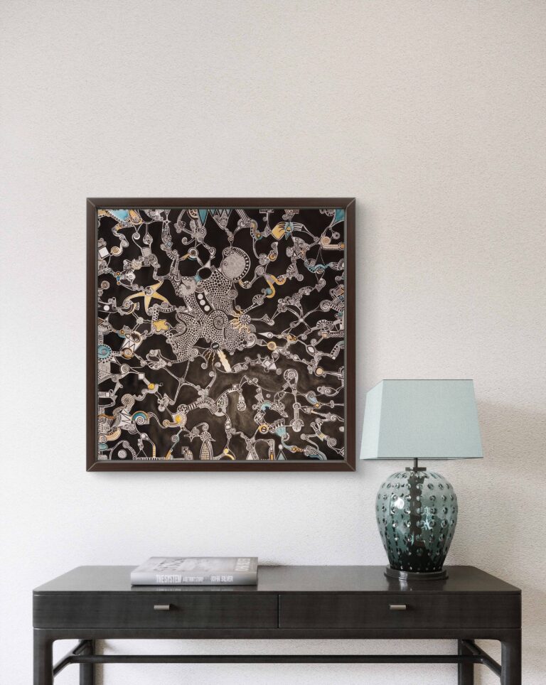Obraz w tej aranżacji staje się wyrazistym punktem centralnym wnętrza. Zawieszony na jasnej, neutralnej ścianie przyciąga uwagę bogactwem detali i dynamiczną, niemal organiczną kompozycją. Abstrakcyjne linie i symbole, kontrastujące z ciemnym tłem, wprowadzają do przestrzeni nutę tajemniczości i artystycznej energii. Prosta konsola i minimalistyczna lampa równoważą złożoność dzieła, dzięki czemu całość prezentuje się elegancko, nowocześnie …